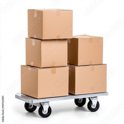 A photostock of a small stack of cardboard boxes on a dolly, isolated on a white surface, practical and versatile, High Quality