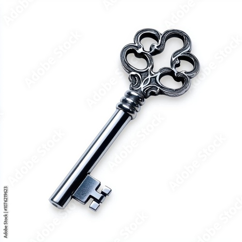 A photostock of an antique silver key with intricate design, ideal for mystery or vintage themes, isolated on transparent PNG background, High Quality