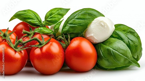 A photostock of cherry tomatoes with mozzarella and basil leaves on a white background, fresh and appetizing.