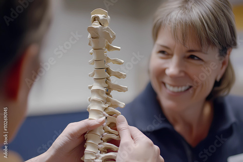A physical therapist is smiling and holding an anatomical model of the spine while talking to her patient, close-up shot
