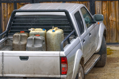 A pickup truck with plastic cans is parked at a wooden gate