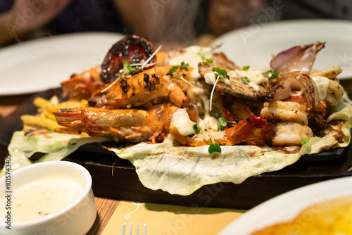A picture of mixed seafood sizzler with prawns,fish,lobster,squid,vegetables and rice