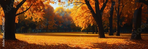 A picturesque autumn park scene with vibrant golden leaves carpeting the ground, showcasing the beauty of nature's seasonal transformation. The sun's rays illuminate the foliage, casting warm shadows