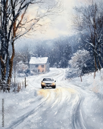 A picturesque country road with a car on a snowy day in winter, close-up.