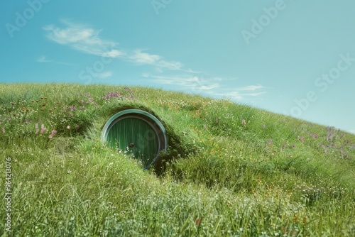 A picturesque green hill with a quaint circular door built into its side, evoking a fantastical, storybook charm under a clear blue sky.