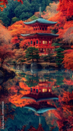 A picturesque night scene of the autumn leaves at Kiyomizudera National Park, with reflections on a tranquil pond and illuminated pagodas in red hues