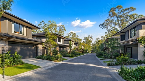 A picturesque suburban street lined with modern residential houses, each featuring manicured gardens and lush greenery, set under a bright blue sky, representing ideal real estate living.