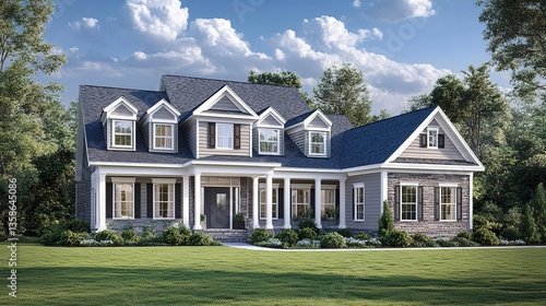 A picturesque two-story house with dormers adorning the roofline, their geometric shapes and crisp white frames complementing the home's classic style.