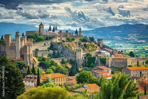 A picturesque view of a castle perched on the top of a hill, with lush greenery and a serene atmosphere