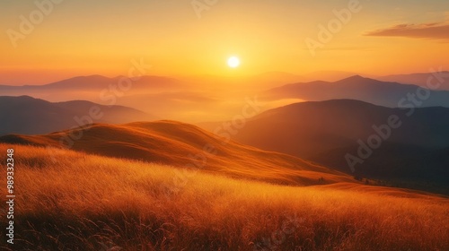 A picturesque view of a sunset over rolling hills and a valley with fog, a vibrant orange sky with warm golden light.