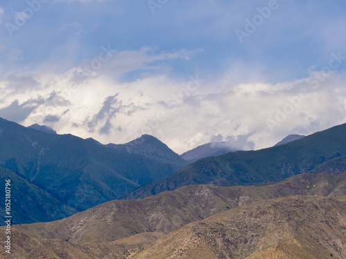 mountain, landscape, cloud, kyrgyzstan, nature, hill, green, brown, rugged, peak, outdoors, scenic, travel, tour tourism, wilderness, majestic, blue skies, geography, natural, environment, adventure, exploration, calmness, serene, highland, dramatic, countryside, beauty, sky, vale, mountain chain, scenic view, alpine, hiking, terrain, asia, remote, peaceful, cloudscape, summer, earth