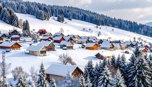 A picturesque village nestled amidst snow-covered hills and evergreen forests under a bright sky. Wooden homes with colorful roofs dot the landscape, creating a cozy and idyllic winter scene