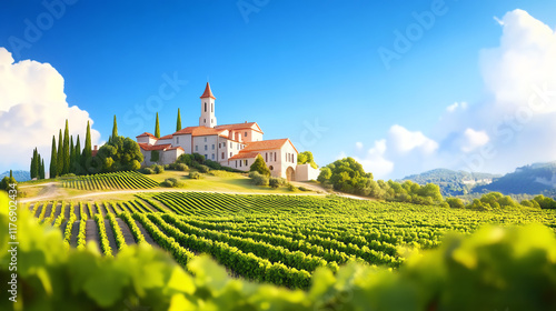 A picturesque vineyard landscape with lush greenery, rolling hills, and a charming architecture under a clear blue sky.