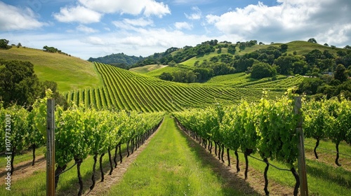 A picturesque vineyard with rolling hills and rows of grapevines.