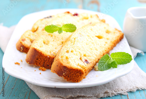leaf, decoration, butter, nobody, crust, dessert, sweet, banana, dough, snack, drink, egg, vanilla, nut, homemade, epicure, biscuit, vertical, traditional, tea, pie, cake, sugar, refreshment, pastry, fruit, background, cooking, baked, sponge, food, eating, ingredient, mint, grape, portion, freshness