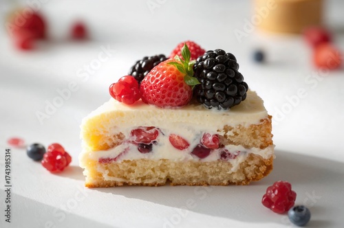 A piece of seasonal cake topped with vanilla frosting and assorted fresh berries