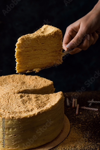 cake, napoleon, dark, still life, dessert, sweet, white, cream, pie, food, pastry, baking, sugar, traditional, tasty, hand, piece, woman
