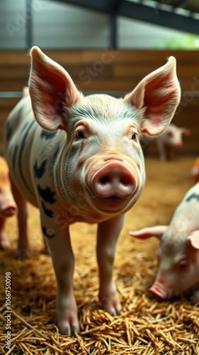 A piglet stands in a pen, looking directly at the camera with a curious expression