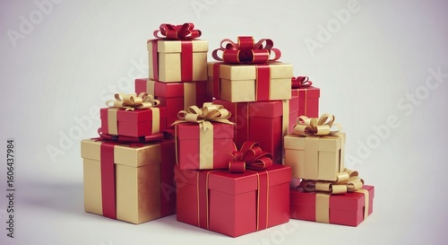 A pile of beautifully wrapped gift boxes with red and gold ribbons