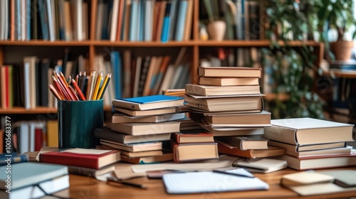 A pile of books, notebooks, and stationery such as pens and pencils laid out on a table, set against a realistic background of a home office