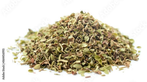 A pile of dried herbs on a white surface, suitable for use in cooking or as a decorative element