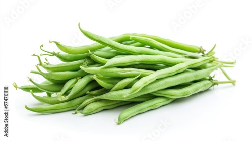 A pile of fresh green beans on a white background, ideal for cooking and healthy meals.