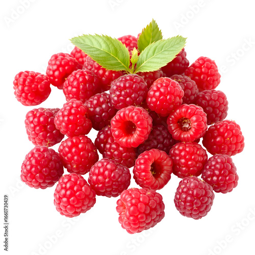 A pile of fresh, ripe raspberries with green leaves on a white background, showcasing their vibrant red color and texture.