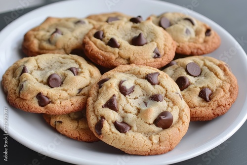 A pile of freshly baked chocolate chip cookies rests on a white plate baked goods