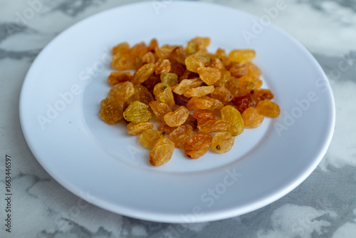 A pile of golden raisins sits on a small white plate against a marble background. These sweet, dried grapes are a traditional Plov ingredient, adding a unique flavor. Perfect for recipe blogs and cook
