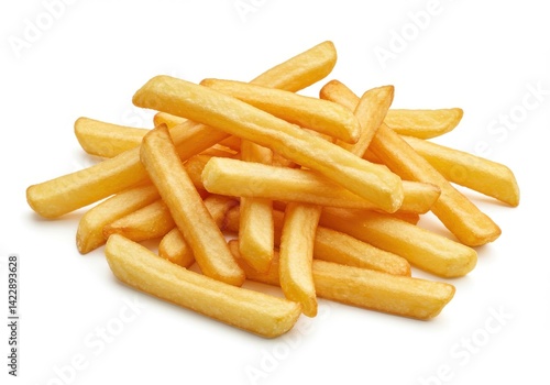 A pile of golden yellow french fries scattered on a white surface in a close up studio shot view