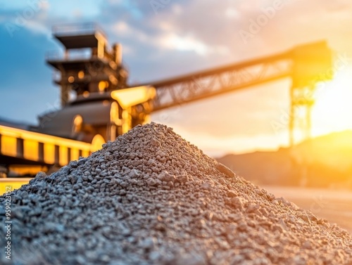 A pile of gravel in a quarry with a conveyor belt in the background. The sun shines brightly, creating a warm glow.