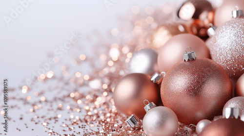 A pile of metallic glass ornaments, with glitter on them in large and small sizes, Christmas tree toys arranged to create a festive atmosphere for Christmas