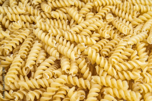 A pile of raw italian fusilli spiral pasta. Texture background.