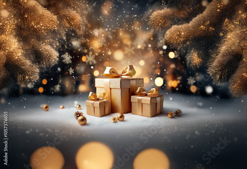 A pile of wrapped gifts sits on a snowy surface surrounded by pine branches and bokeh lights.