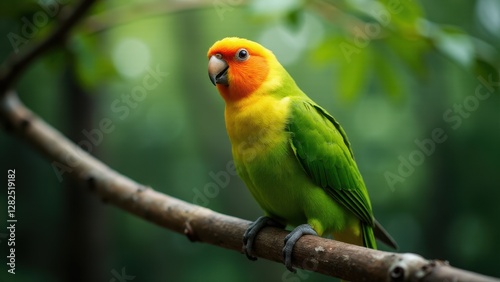 bird, parrot, green, yellow, orange, tree branch, nature, wildlife, feather, tropical, exotic, avian, pet, colourful, beak, forest, perch, jungle, vibrant, plumage, small, animal, fauna, outdoors, tree, leaf, rainforest, bright, perched, closeup, detailed, natural, habitat, wild, beautiful, pineapple, birding, environment, greenery, foliage, tropical bird