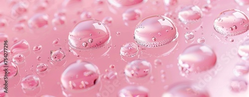A pink background with transparent gel droplets floating. Abstract background with clear serum or gel drops. Flat lay of hydro alcoholic gel splashes