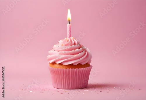 A pink birthday cupcake with a lit candle on a pink and white background with sparkles