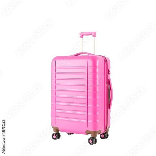 A pink suitcase with a silver handle and black wheels on a black background.