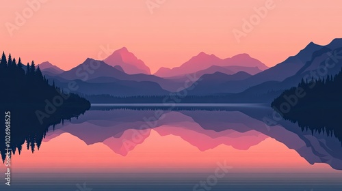 A pink sunset reflecting over a still lake, with mountains silhouetted in the background