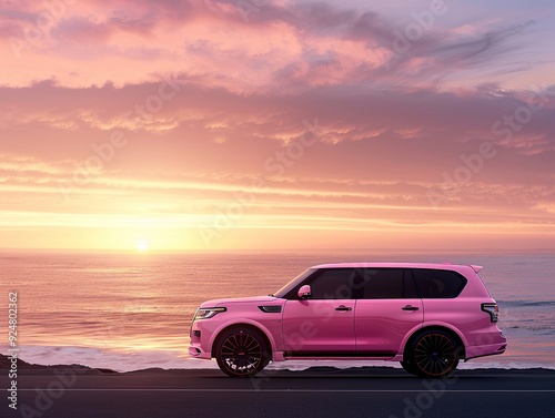 pink, suv, parked, beach, sunrise, vehicle, coastal, sand, ocean, morning, travel, luxury, horizon, scenic, vibrant, automotive, summer, relaxing, vacation, stylish, serene, nature, transportation, view