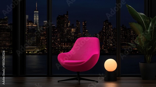 room, chair, window, pink, lamp, modern, living, large, view, skyline, night, warm, atmosphere, plush, cushion, round, shade, black, racked, potted, plant, touch, greenery, space, floor, dark, wood, overall, aesthetic, living room, potted plants, right side