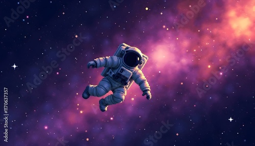 A pixel art portrayal of an astronaut suspended in a star-filled space environment, highlighting the vastness of the universe