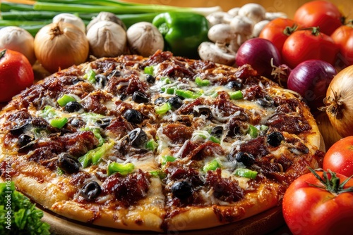 A pizza topped with meat, olives, and peppers, surrounded by fresh produce