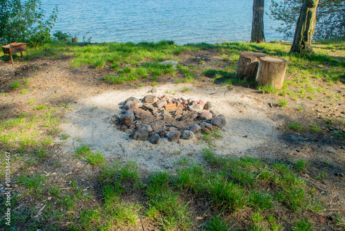 A place with an extinguished campfire on the seashore. A fire pit lined with sea pebbles. A campsite with old bonfire for tourists.