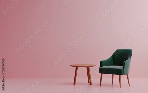A plain pink wall with a green velvet chair and a wooden side table placed on the right, creating an elegant yet minimalist setting