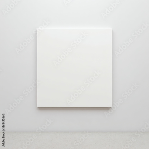A plain white square canvas displayed on a minimalist gallery wall with a concrete floor.