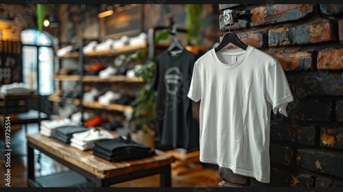 shirt, white, clothing, fashion, apparel, hanger, store, shop, retail, brick, wall, background, minimal, simple, design, style, casual attire, tee, cotton, fabric, texture, colours, clean, fresh, new, blank, empty, product, display, front, view, sale, clothes, garment, hang, interior, rack, shelf, wood, rustic