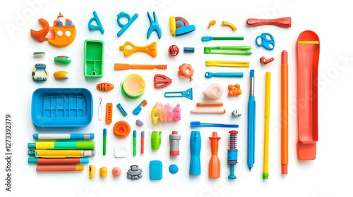 plastic, toy, stationery, set, displayed, flat, lay, composition, isolated, white, background, clean, modern, look