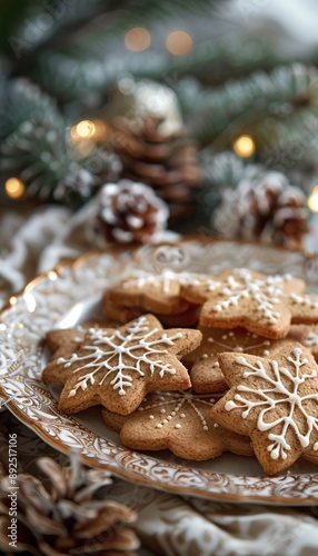 still life, snowflake, plate, glass plate, background, decorate, pastry, pine cone, table, depth of field, frost, biscuit, icing, food, gingerbread, realistic, platter