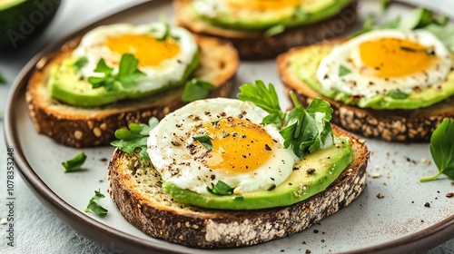 A plate of avocado toast topped with a fried egg and garnished with herbs.